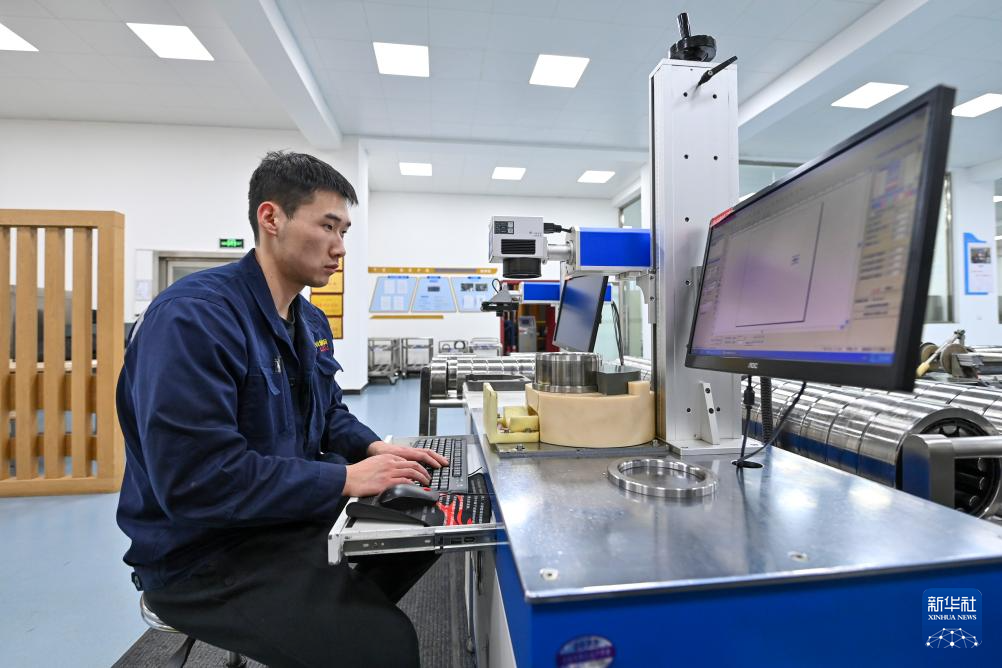 在中国铁路太原局集团有限公司太原车辆段轮轴车间,轴承组车辆钳工张明敏为轴承打码,此举相当于为轴承录入“身份信息”,可记录轴承编号、型号、制造年月等信息(1月9日摄)。