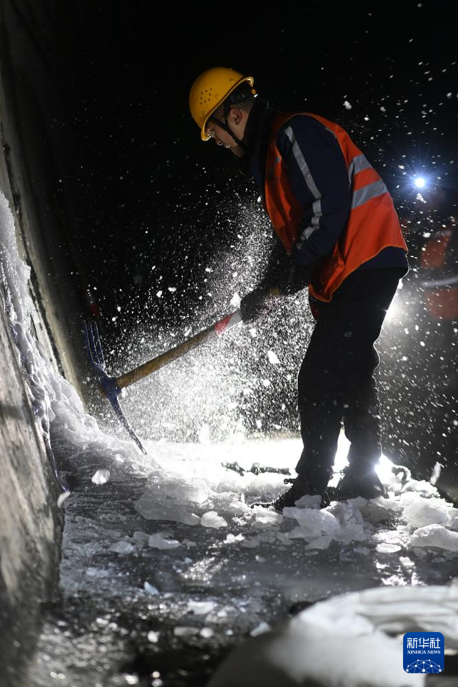 中国铁路太原局集团有限公司太原南工务段吕梁山隧道打冰工马国伟在隧道里除冰(1月9日摄)。