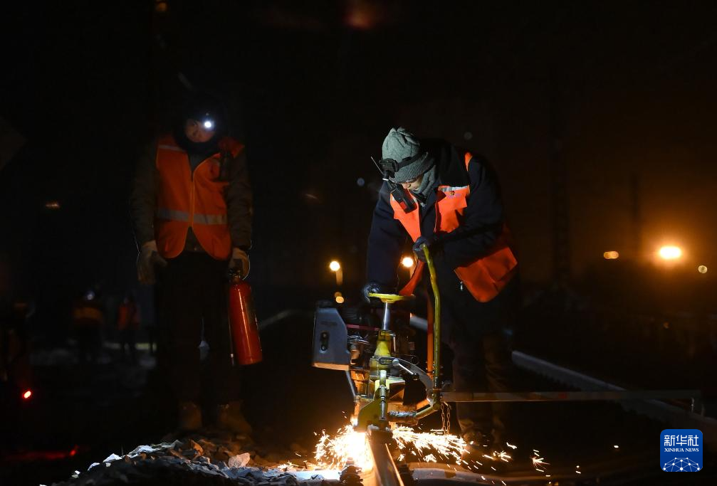 中国铁路太原局集团有限公司太原南工务段吕梁线路车间铁路维修工梁小刚(右)在进行维修作业(1月9日摄)。