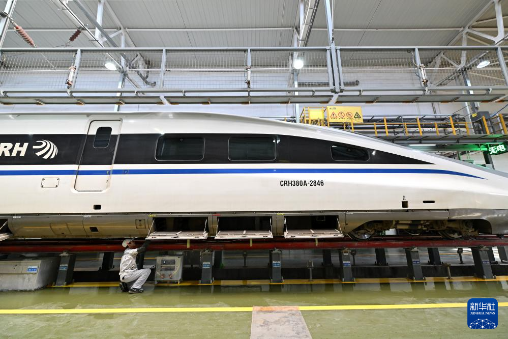 在太原动车组运用所,动车组机械师李珍河在列车底部进行检查维护(1月9日摄)。