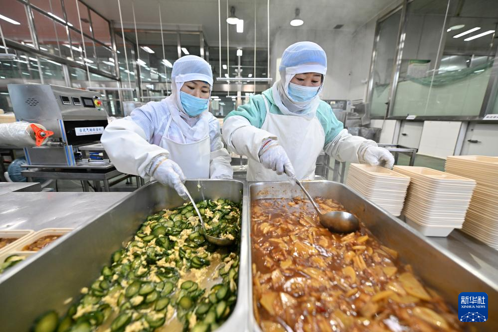 在中国铁路太原局集团有限公司太原客运段洗涤配餐中心配餐车间,配餐工将饭菜装盒(1月9日摄)。