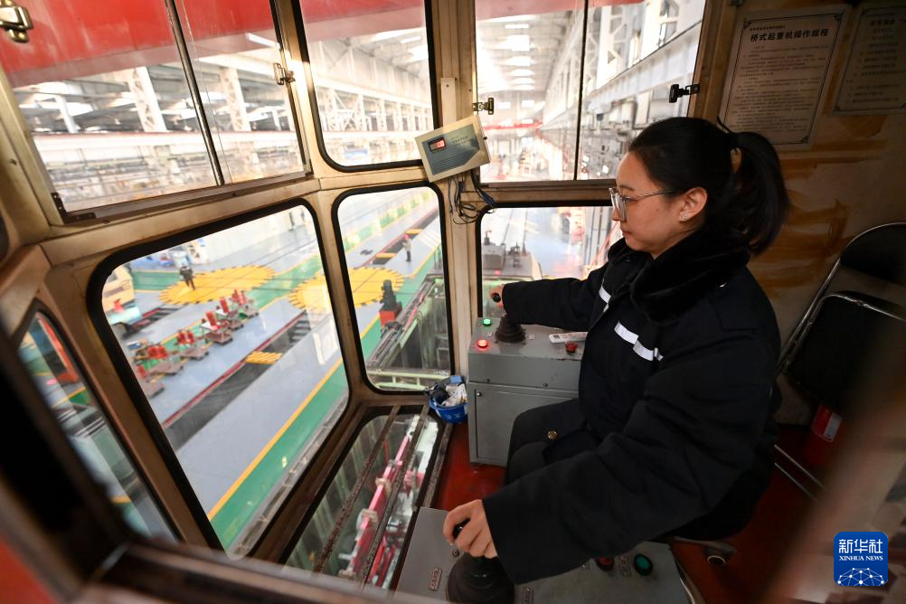 在中国铁路太原局集团有限公司太原机务段太北检修车间,天车司机王孟媛在天车上作业(1月10日摄)。