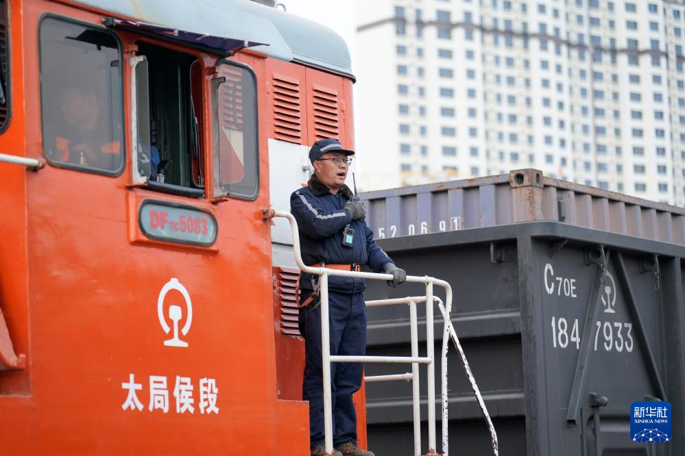 在山西省运城市运城站,调车司机赵杰在指挥调车作业(1月11日摄)。