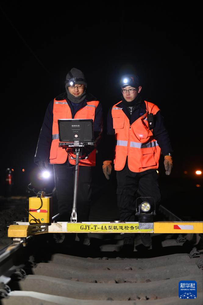 中国铁路太原局集团有限公司太原南工务段吕梁线路车间铁路线路工马星硕(右)、程鑫在检查线路(1月9日摄)。