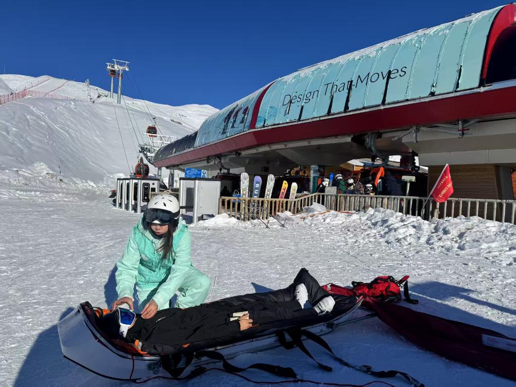 一次巡逻时,帕提曼看到一名雪友横躺在雪道中间,雪板被甩出很远,上前查看后发现其大腿骨折。她立即进行夹板固定、纱布包扎等操作,随后协助转运伤员。