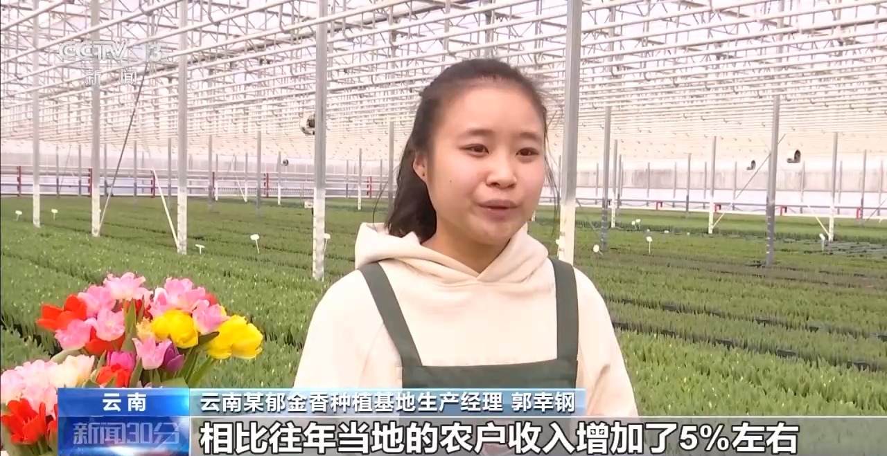 云南某郁金香种植基地生产经理郭幸钢:主要是因为市场需求旺盛,相比往年也为当地农户增收了5%左右。