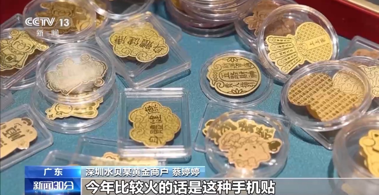 深圳水贝某黄金商户 蔡婷婷:今年比较火的是这种手机贴,可以贴在我们的手机壳后面,又是几十块钱的小克重款。