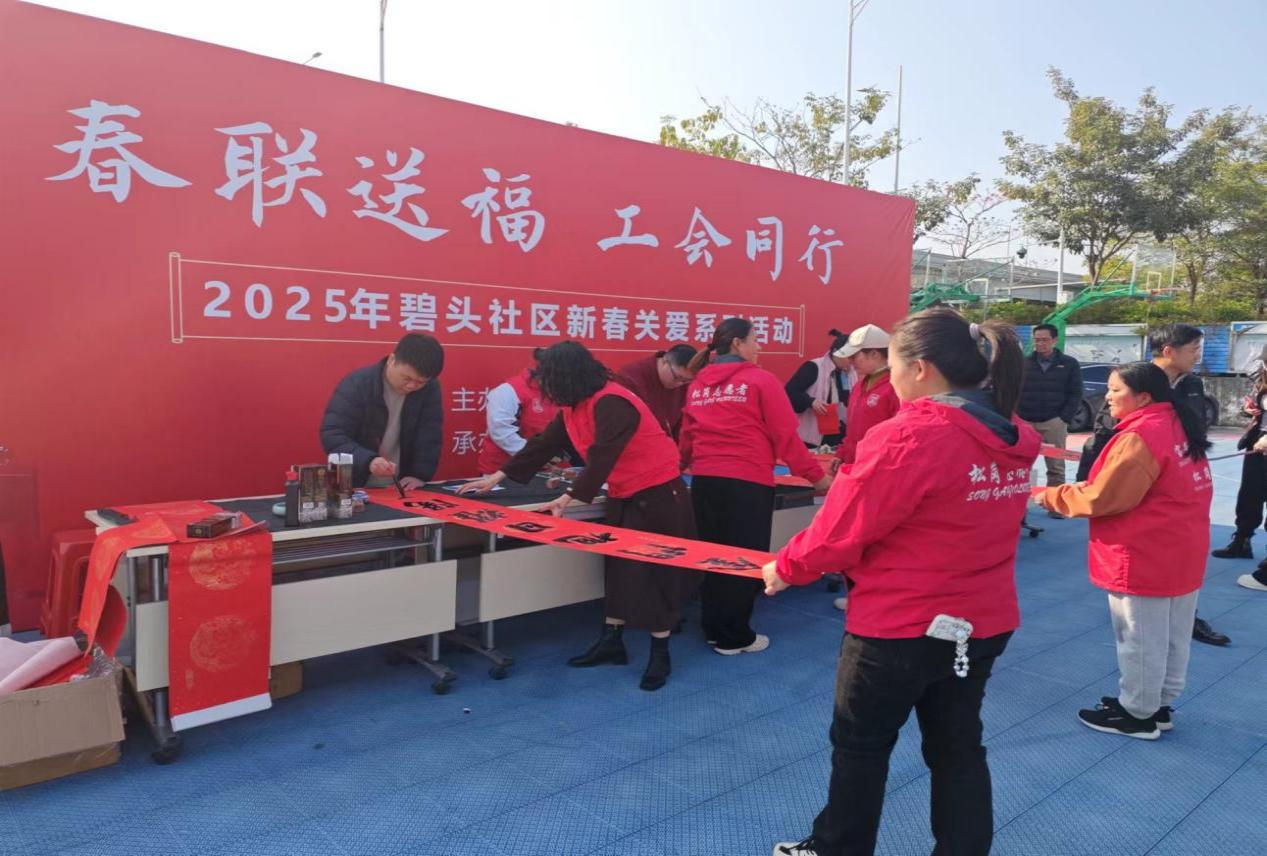 在街道总工会的指导下,楼岗、碧头、松岗、东方等社区工联会相继开展“义写春联迎新春”活动,拉开了新春系列活动的序幕。活动邀请书法爱好者为职工们现场书写寓意吉祥的春联,一副副手写的春联,不仅展示了传统文化书法艺术的魅力,更传递了工会对职工的新春祝福与美好祝愿。活动约1000人参与,职工们纷纷表示,这份来自工会的新春礼物,让他们感受到了温暖与喜悦。