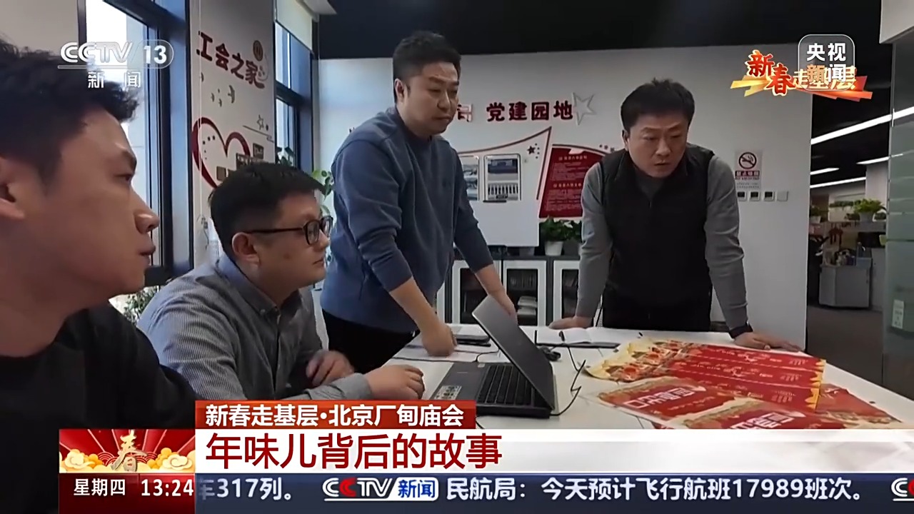 桂鹏是今年庙会承办方景观布置组的负责人,他负责的道旗、商户的招幌,还有过街天桥上的主视觉要在小年前整体亮相,但设计方案却一改再改。虽然已经连续12年参与到厂甸庙会的组织筹办中,也算是经验老到了,但镜头里的他还是难掩疲惫和焦虑。