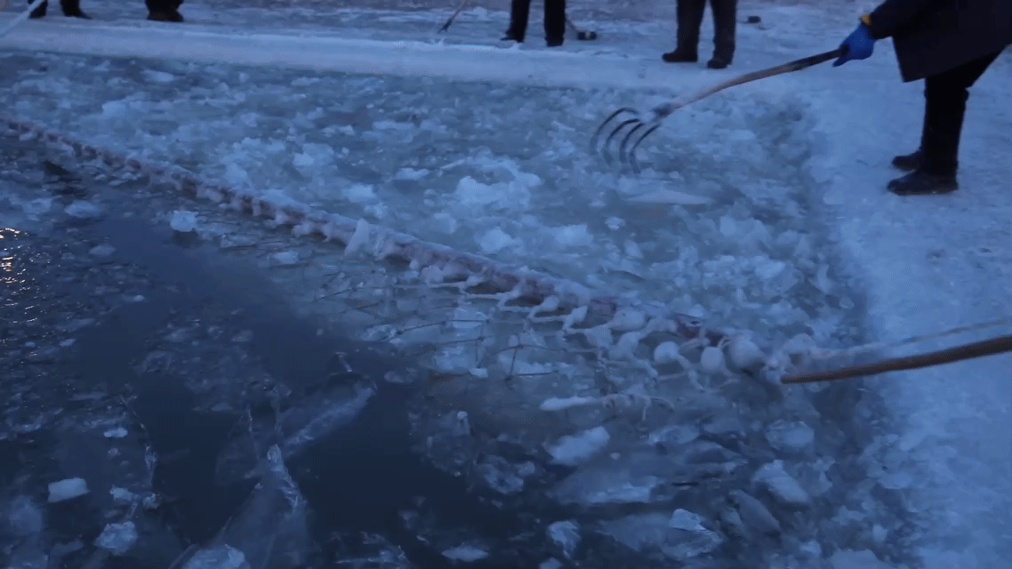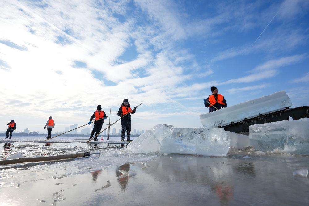 2024年12月9日,工人在松花江哈尔滨段采冰。
