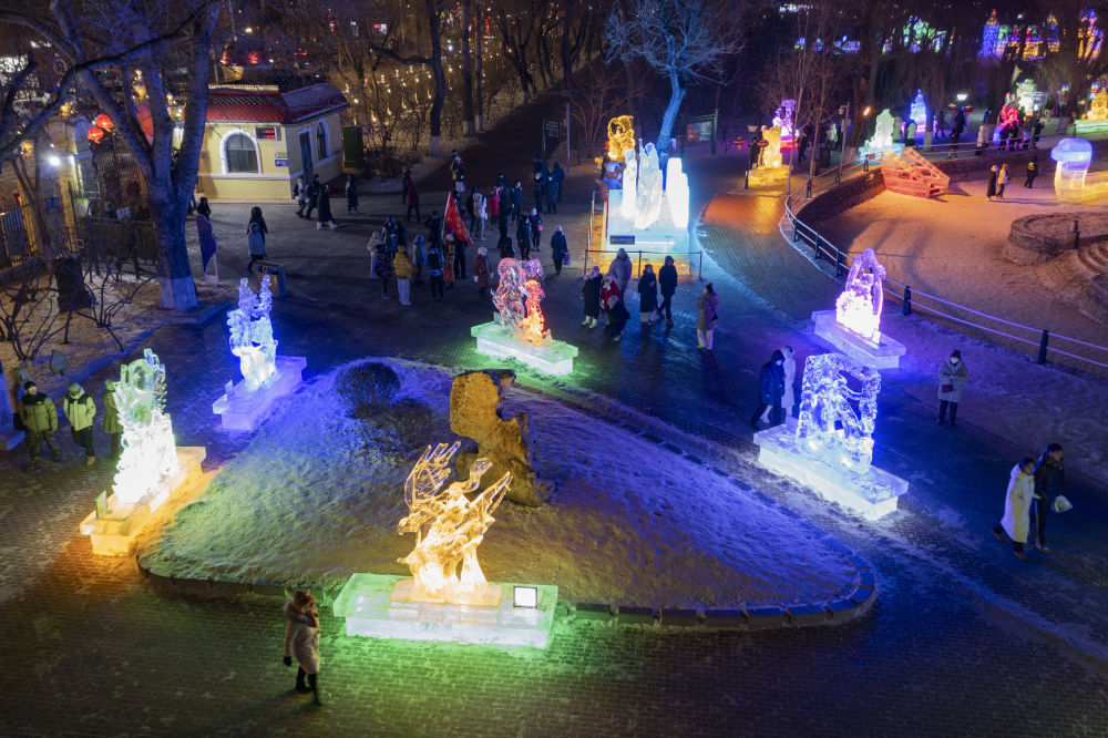 2025年1月2日,在哈尔滨市兆麟公园,游客在冰灯艺术游园会园区内观赏冰灯(无人机照片)。