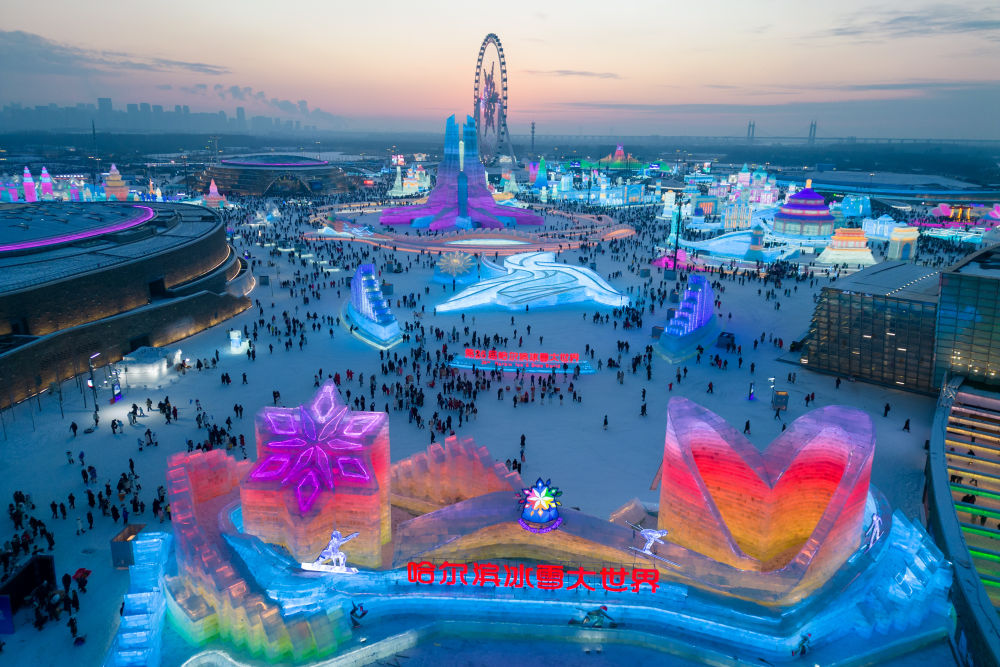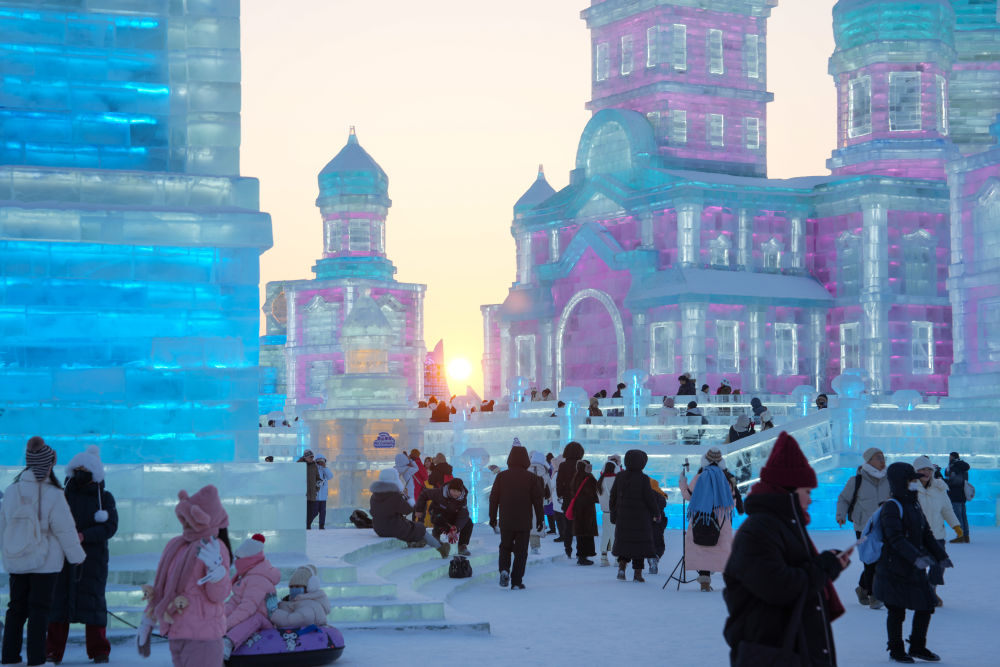 2025年1月23日,夕阳下,游客在哈尔滨冰雪大世界园区内游玩、拍照。