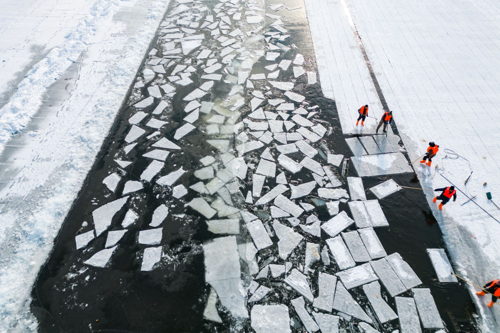 2024年12月9日,工人在松花江哈尔滨段采冰(无人机照片)。