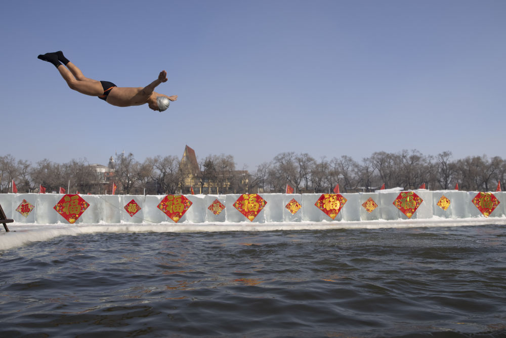 2022年1月31日,冬泳爱好者跃入松花江中。