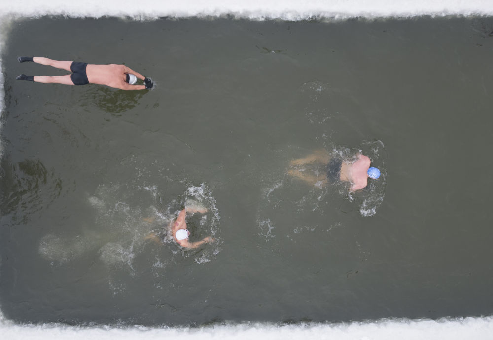 2024年1月1日,冬泳爱好者在黑龙江哈尔滨松花江上畅游(无人机照片)。