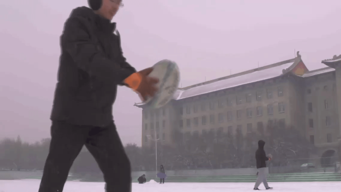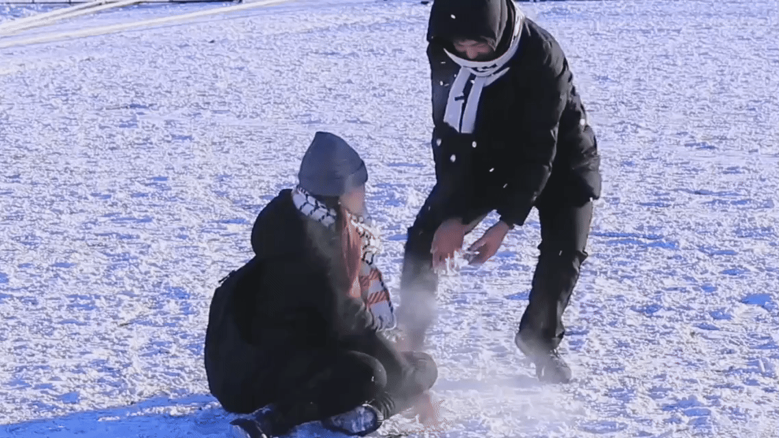 2023年12月7日,市民在第四届哈尔滨采冰节活动现场抽冰尜。
