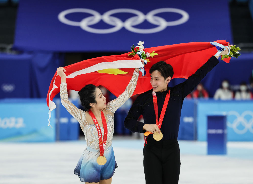 2022年2月19日,北京2022年冬奥会花样滑冰双人滑自由滑比赛在首都体育馆举行,中国选手隋文静(左)/韩聪夺得双人滑冠军。