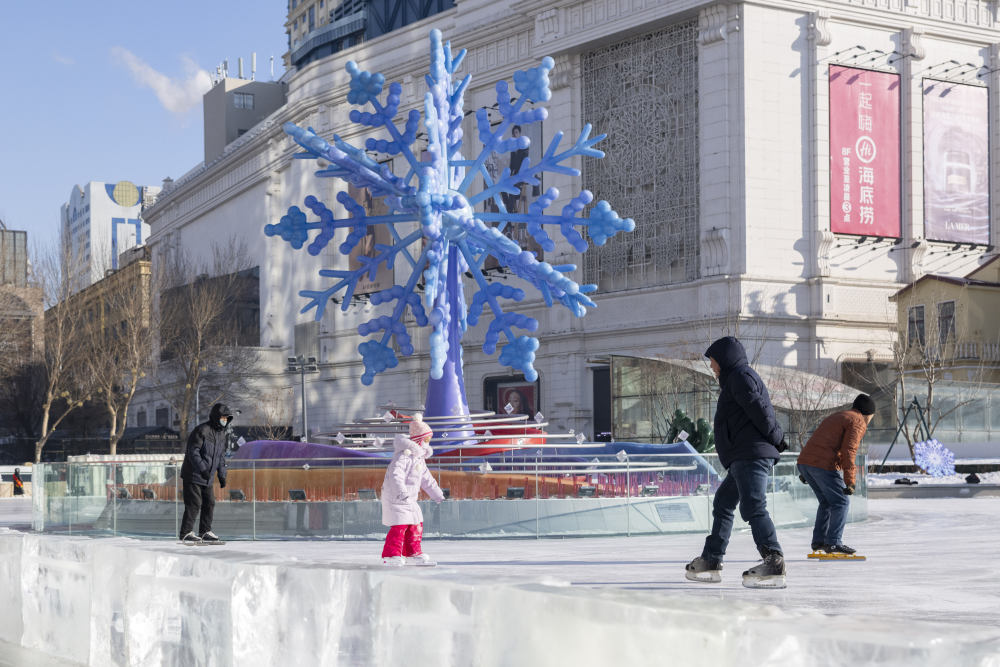 2025年1月4日,在哈尔滨市南岗区一处公益冰场,人们在“冰雪之冠”雕塑旁滑冰。