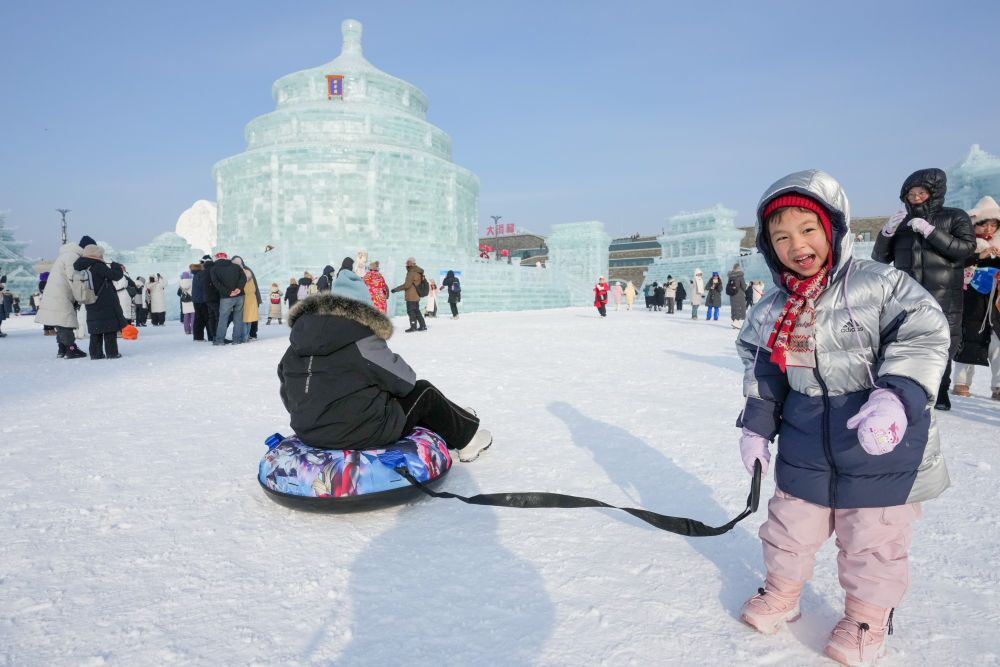 2024年12月21日,小朋友在哈尔滨冰雪大世界园区拉雪圈。