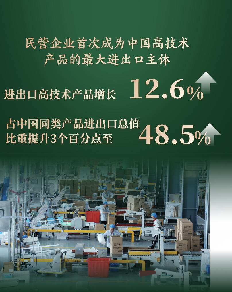 民营企业首次成为中国高技术产品的最大进出口主体,进出口高技术产品增长12.6%,占中国同类产品进出口总值比重提升3个百分点至48.5%。