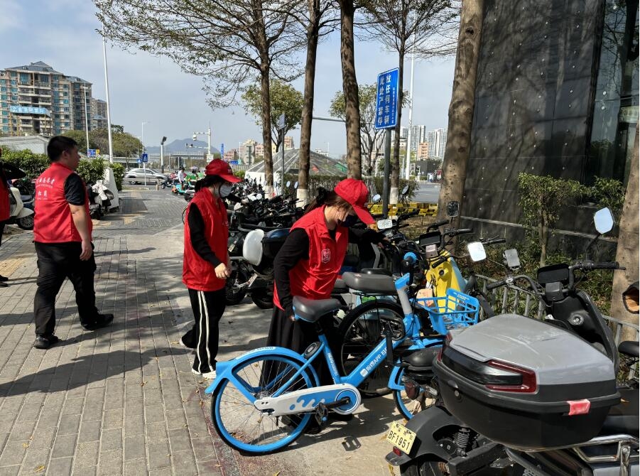 活动中,松岗志愿者们身穿红马甲,活跃在松岗的各个角落。他们深入U站、大街小巷以及商铺门前等区域,对共享单车和电动车的乱停放现象进行了有效的整治。志愿者们以实际行动对非机动车进行了有序的整理和规范的停放,为市民创造了一个更加整洁、有序的市容环境。志愿者们不仅将车辆摆放得井井有条,还对车主进行了友好的劝导,强调了文明停车的重要性。