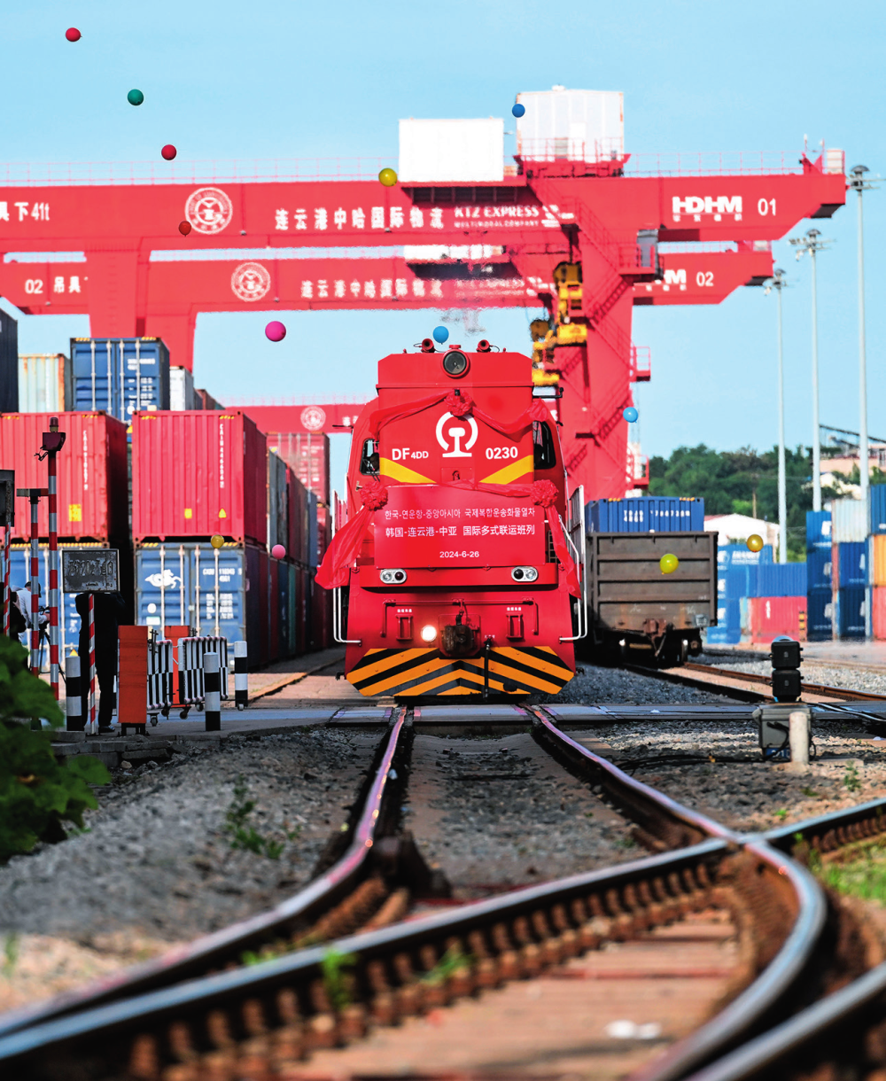 “韩国 - 连云港 - 中亚”国际多式联运班列从中哈连云港物流合作基地出发,驶往哈萨克斯坦、乌兹别克斯坦(2024 年 6 月 26 日摄) 季春鹏摄 / 本刊