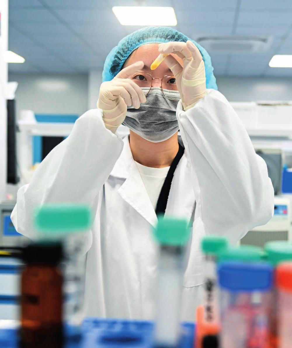 在盛世泰科生物医药技术(苏州)有限公司实验室, 工作人员观察化合物配制状态(2024 年 11 月 12 日摄) 季春鹏摄 / 本刊