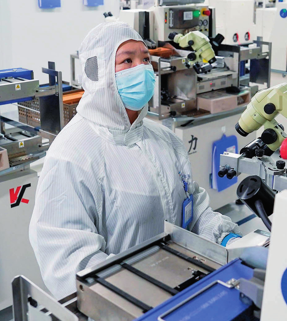 在位于江苏南通如东经济开发区的南通宁芯微 电子有限公司,工作人员在装片焊线车间内作业 (2024 年 11 月 2 日摄) 李博摄 / 本刊