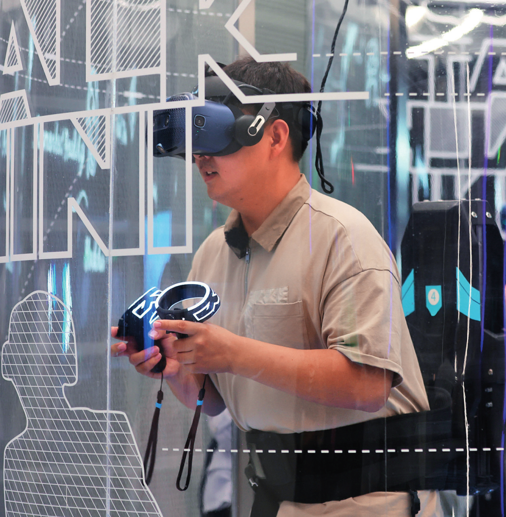 位于苏州昆山市的昆山元宇宙产业园的元宇宙展示厅里,一名 参观者在体验 VR 游戏(2024 年 6 月 1 日摄) 杨磊摄 / 本刊