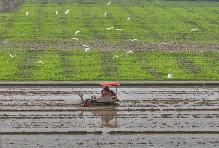 2025年2月25日,在浙江省瑞安市马屿镇儒阳村,农机在田间犁地,白鹭低空而飞(无人机照片)。新华社发(苏巧将摄)