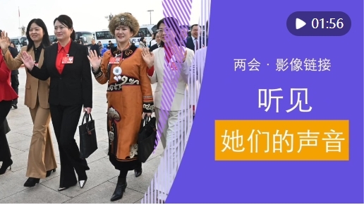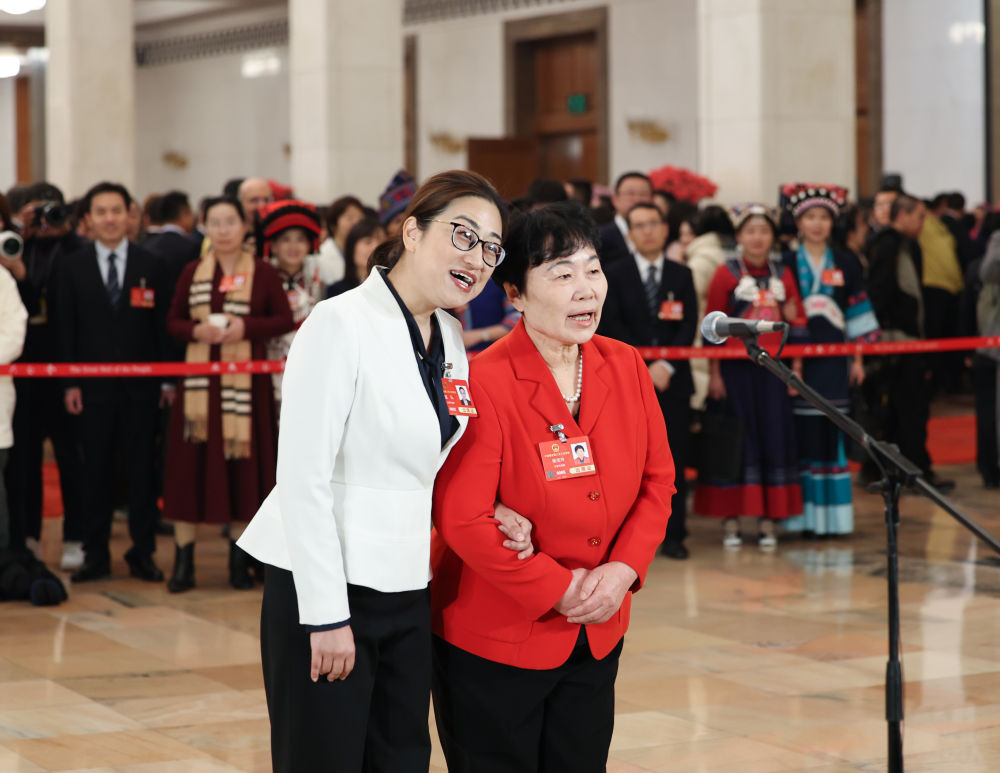 3月8日,第十四届全国人民代表大会第三次会议第二场“代表通道”集中采访活动在北京人民大会堂举行。这是全国人大代表盛弘(左)和杨宝玲向广大妇女致以节日祝福。新华社记者 吕帅 摄