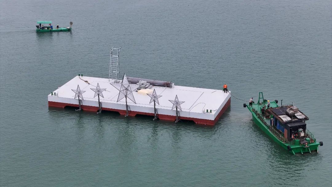 水上文旅配套工程现场已进入昼夜施工模式,全力确保这座集声光电科技与海洋元素于一体的沉浸式舞台如期绽放。