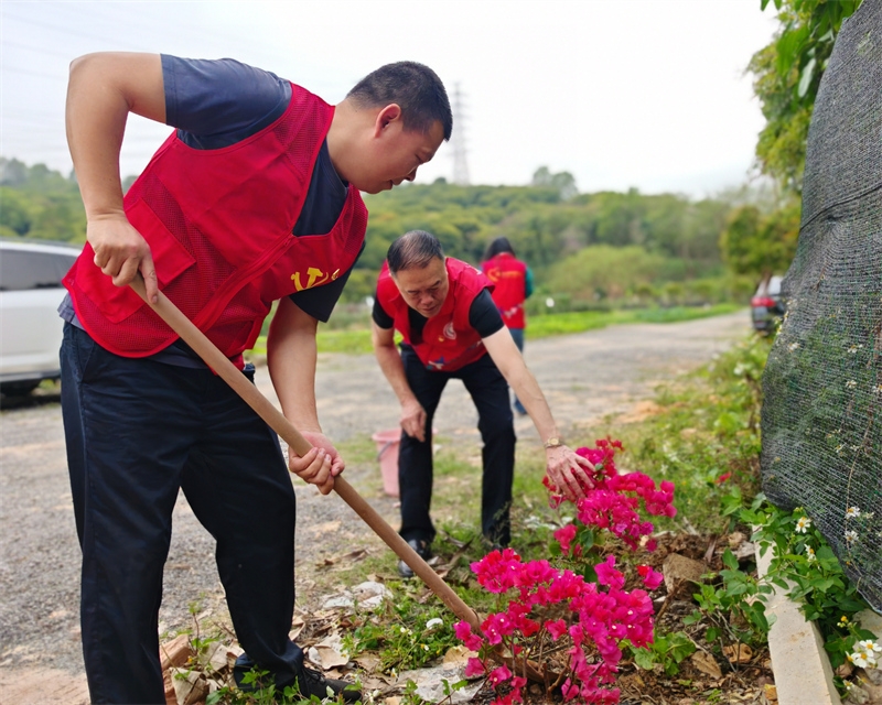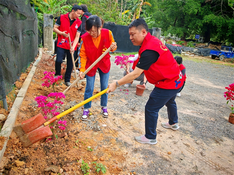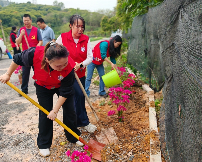 活动当天,阳光明媚,春意盎然。党员们手持铁锹与锄头,迅速集结于植树现场,个个精神抖擞,蓄势待发。在分工明确、协作默契的氛围中,挖坑、扶苗、培土、浇水……一道道工序有条不紊地进行着,现场洋溢着劳动的快乐与团结的力量。春风轻拂,党旗猎猎作响,红色的三角梅在阳光下竞相绽放,与党员们忙碌的身影交相辉映,形成了一道亮丽的风景线。