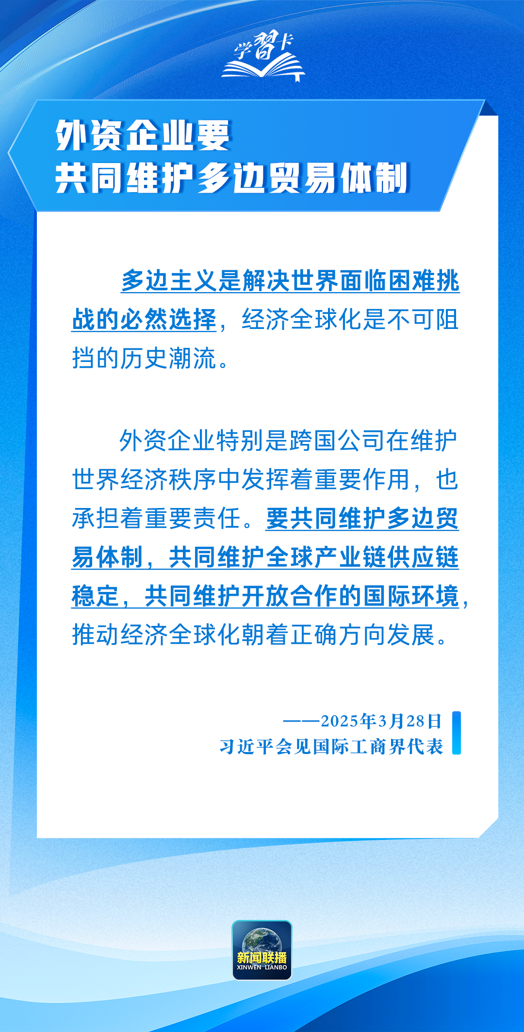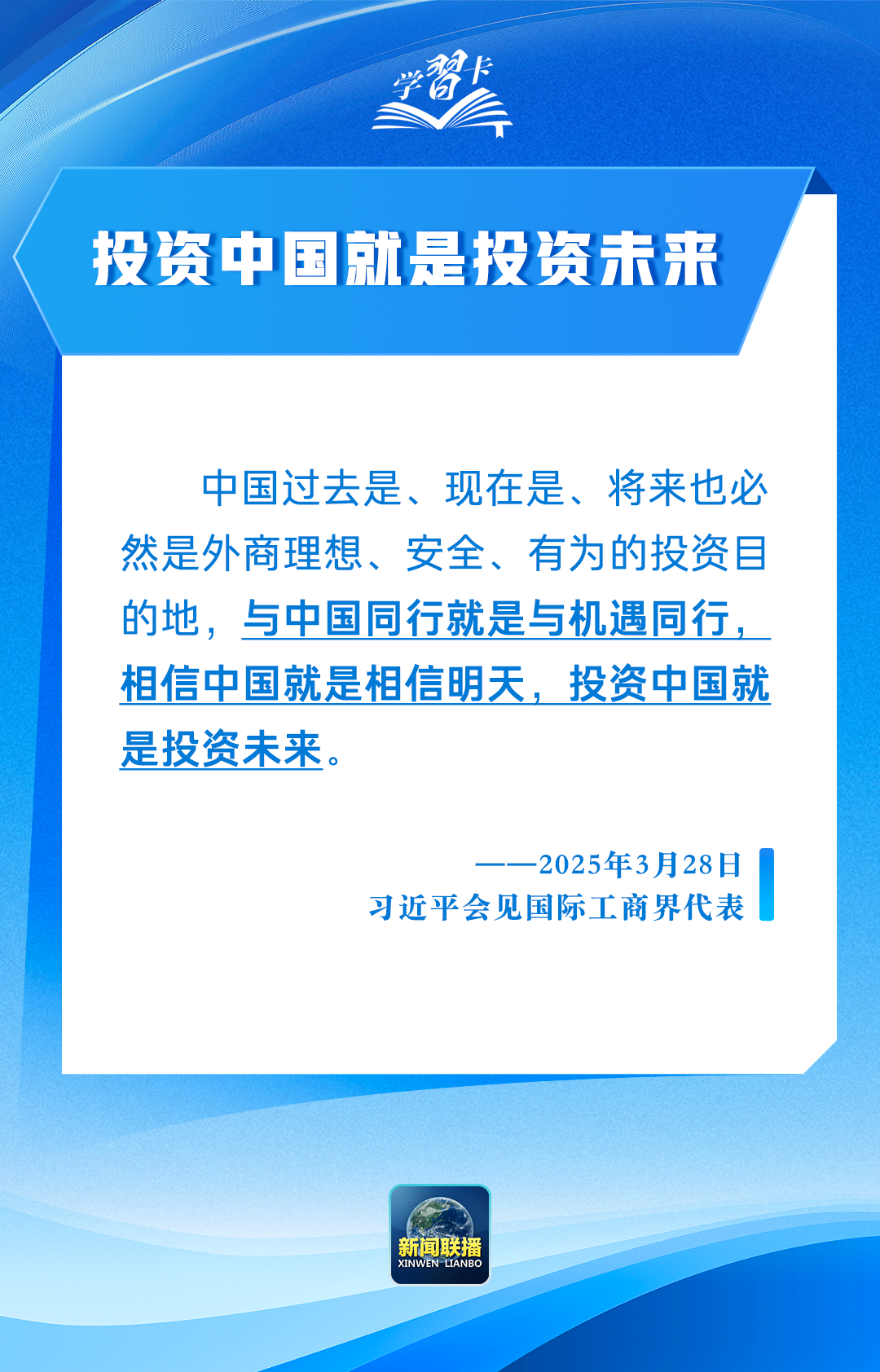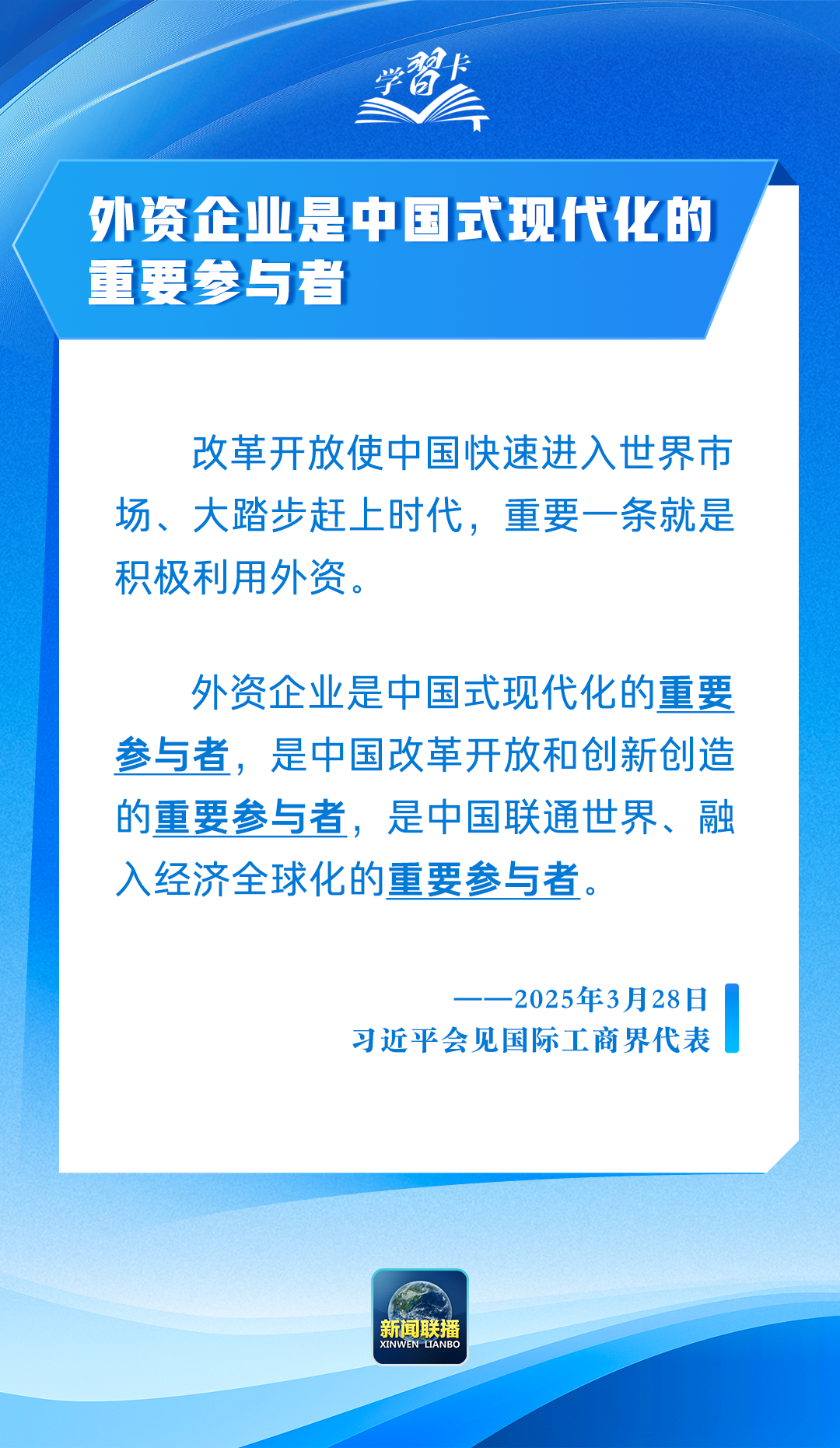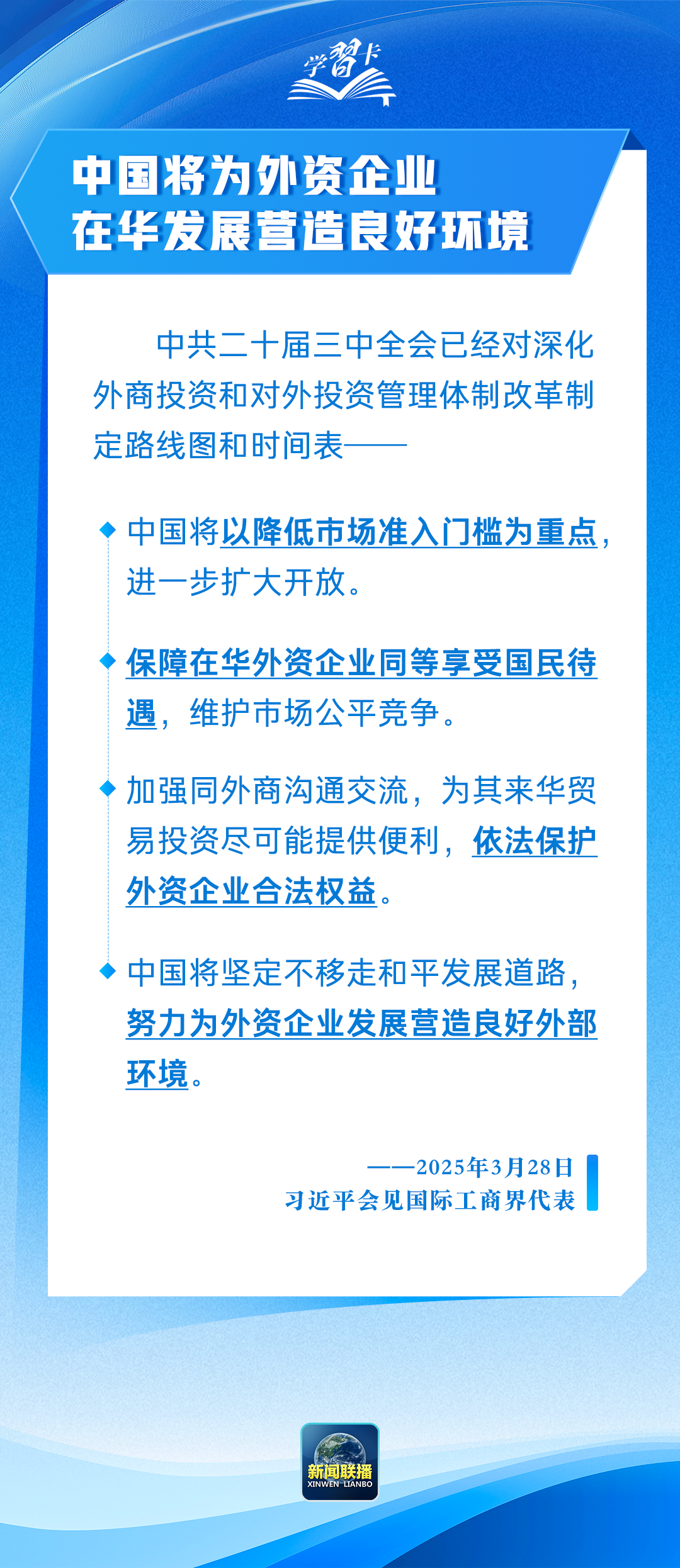 3月28日,国家主席习近平在北京人民大会堂会见国际工商界代表。40余位外资企业全球董事长、首席执行官和商协会代表参加会见,7位外资企业代表先后发言。