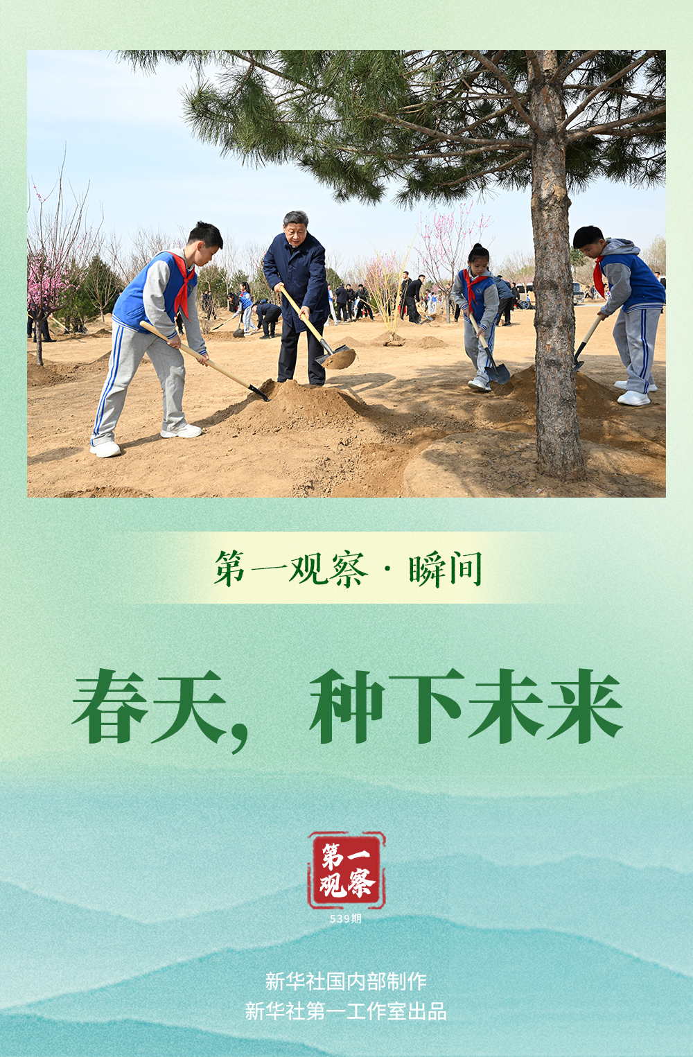 今天种下新绿,小小树苗将长成参天大树、连片成林,祖国大地绿意盎然、生机勃发。今天播撒希望,孩子们终将成为社会发展的栋梁之才,强国建设、民族复兴更有接续奋斗的力量。