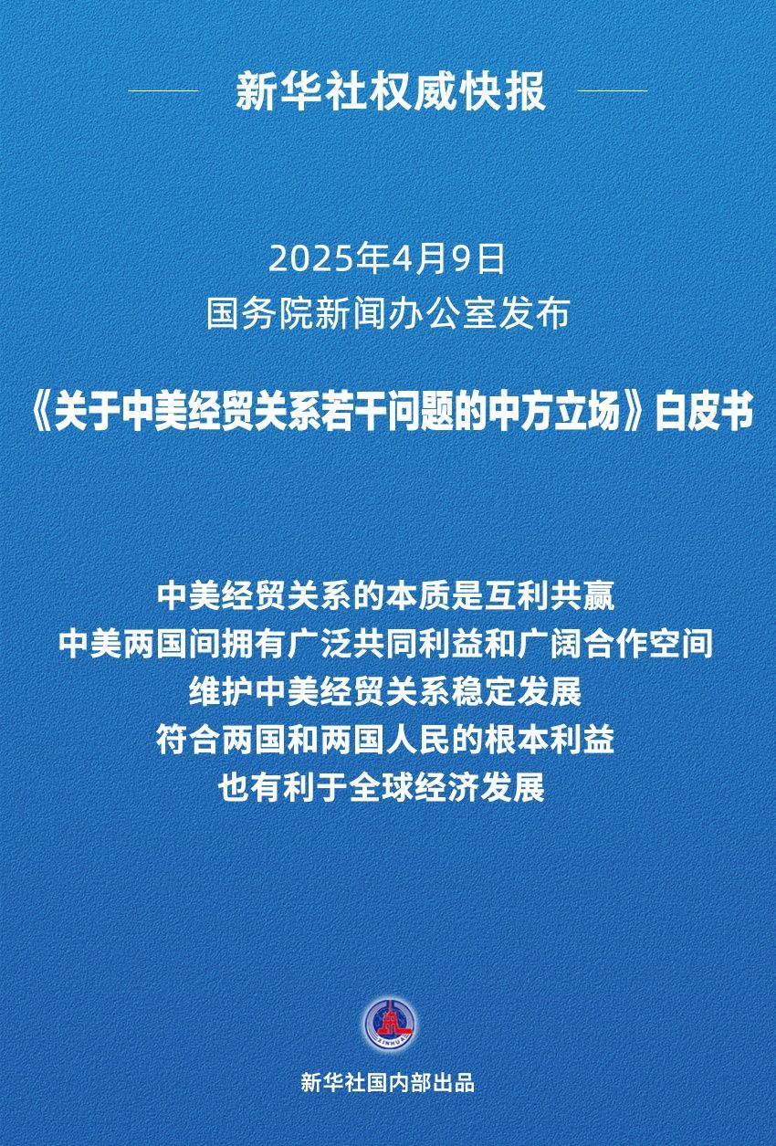 国务院新闻办公室4月9日发布《关于中美经贸关系若干问题的中方立场》白皮书,澄清中美经贸关系事实,阐明中方对相关问题的政策立场。
