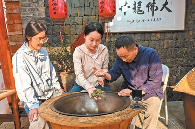 茶山上,茶农用拇指和食指捏住茶叶芽尖,轻轻向上一提,便完成了采摘。在茶农指导下,陈馨怡学得有模有样。随后,陈馨怡来到贤辅村茶事体验中心,跟着手工炒茶师傅学起炒茶,“沉浸感拉满,从枝头到杯中的全过程参与,让我感受到了茶文化的独特魅力。”
