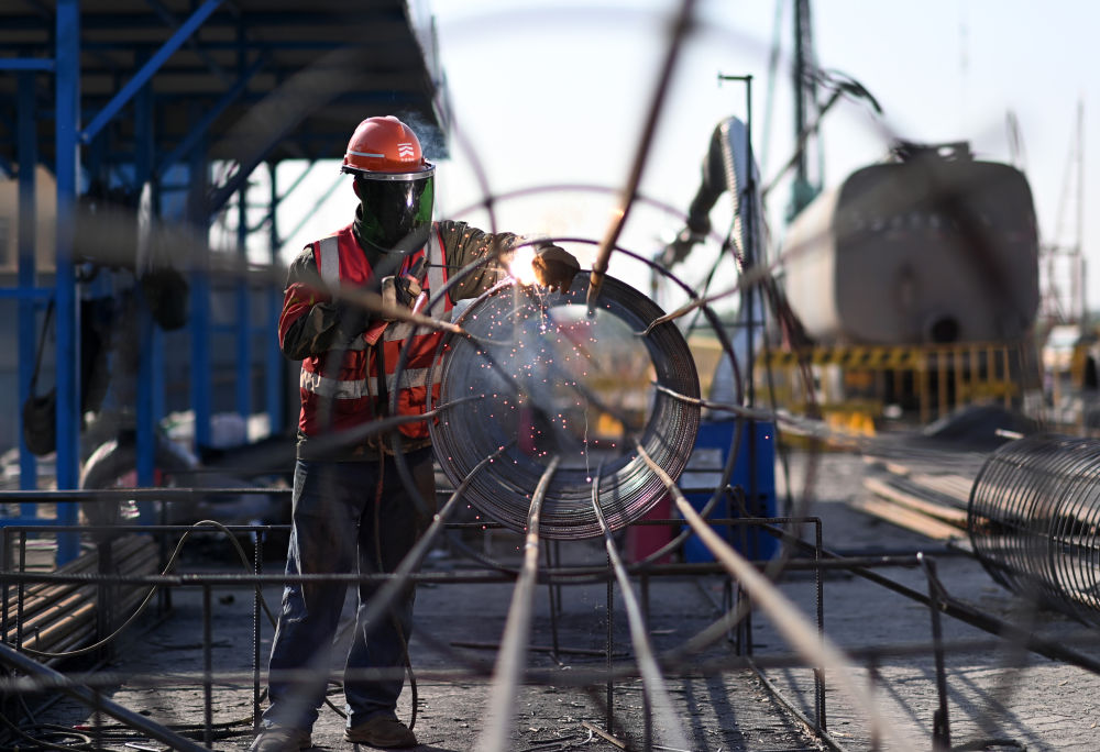 4月25日,工人在天津港第一港埠有限公司散粮三期新建筒仓工程建设现场施工。新华社记者 赵子硕 摄