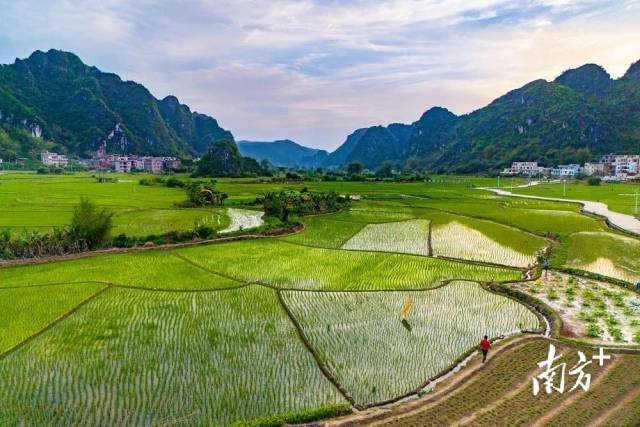 广东云浮罗定市苹塘镇良官村新插不久的秧苗生机勃勃,远处是美丽的石山峰林。南方+拍客 黄冬泳 摄