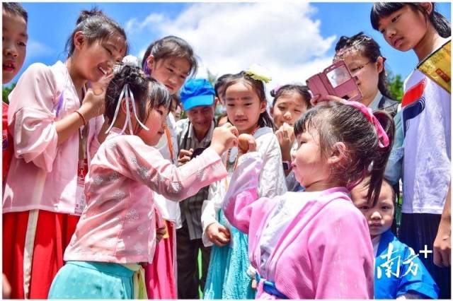 穿汉服的小朋友在体验“斗蛋”游戏。