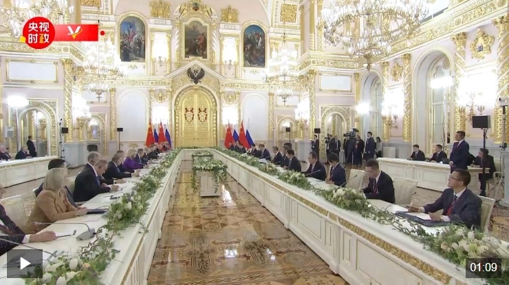 当地时间5月8日上午,俄罗斯总统普京同中国国家主席习近平在莫斯科克里姆林宫举行会谈。