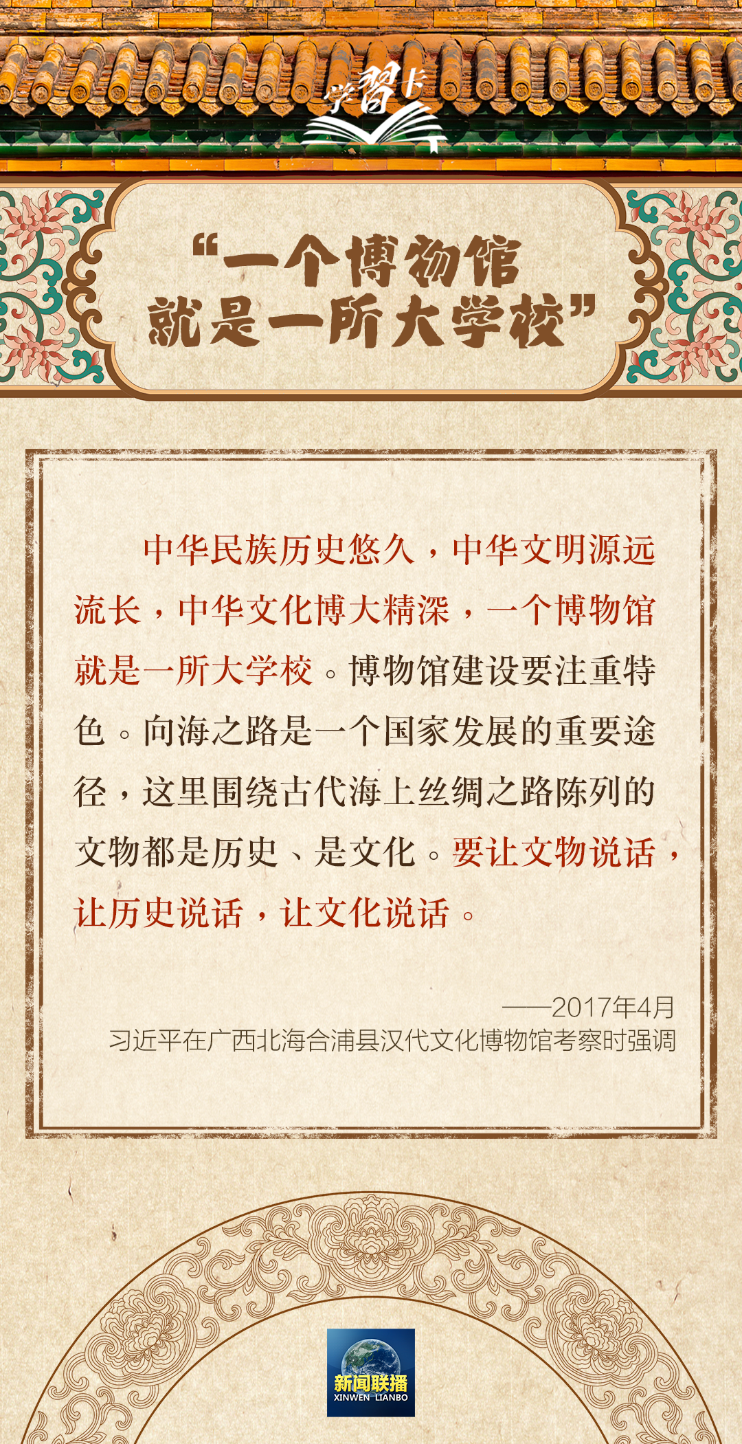 习近平总书记一直高度重视博物馆工作,经常“打卡”博物馆,察看具有浓郁文化色彩的展品,对文物保护和文化传承工作作出重要部署。