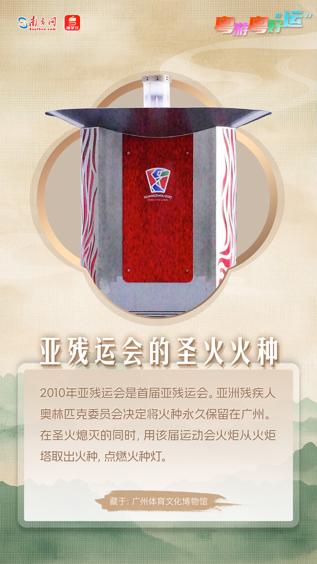 广州体育文化博物馆坐落于广州天河体育中心内原广州亚组委办公大楼旧址,是迄今为止亚洲首家、全国唯一的亚运主题博物馆。馆藏约7000件套,馆内“亚运、亚残运”展区保存和展示了2010年广州亚运会、亚残运会珍贵“遗产”,珍藏着首届亚洲残疾人运动会圣火火种,在这里,大家可以看到亚残运的火种台,感受奥林匹克的光芒。