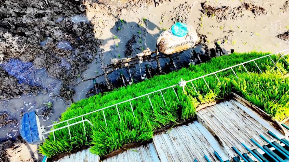 在江苏省常州市天宁区青龙街道武城村的稻田里,3台插秧机来回穿梭在田间,碾过泛起涟漪的水田,将一株株嫩绿的秧苗精准植入大地,种下丰收的希望。