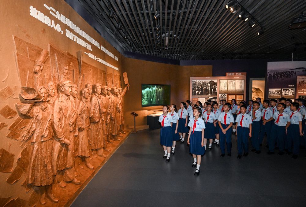 2025年7月7日上午,北京市第十二中学的少先队员参观纪念全民族抗战爆发88周年仪式暨《为了民族解放与世界和平》主题展览。新华社记者 陈晔华 摄
