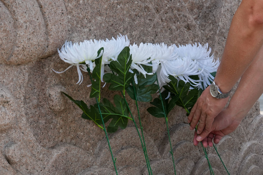2025年7月7日,观众在南京抗日航空烈士纪念馆纪念碑前献花,缅怀英烈。新华社记者 李博 摄
