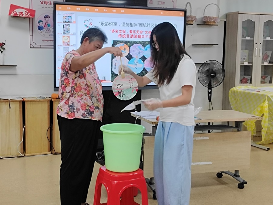 为丰富社区长者精神文化生活,传承中华优秀传统文化,近日,深圳市龙华区观澜街道库坑社区依托“乐龄悦享,温情相伴”长者服务项目,在观澜街道长者服务中心开展了“多彩文娱,‘耆’乐无穷”传统非遗漆扇DIY手工活动。长者在巧手创作中感受非遗魅力,共度欢乐时光。