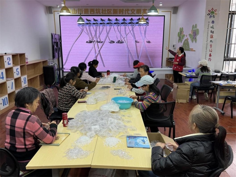 据西坑社区相关负责人介绍,前期关注到社区内居住着一些失业、残障人士,这类人群往往缺少收入来源,经与街道公服办讨论,2024年底便开始筹备“暖心工坊”这一特色服务,活动通过对接辖区相关企业获取手工外包项目,社区提供场地作“工坊”,社工负责培训和发材料,有需求的居民定期到这里做手工活儿,按件计酬,这不仅让居民获得手工技能,还可以在一定程度上解决其收入问题。