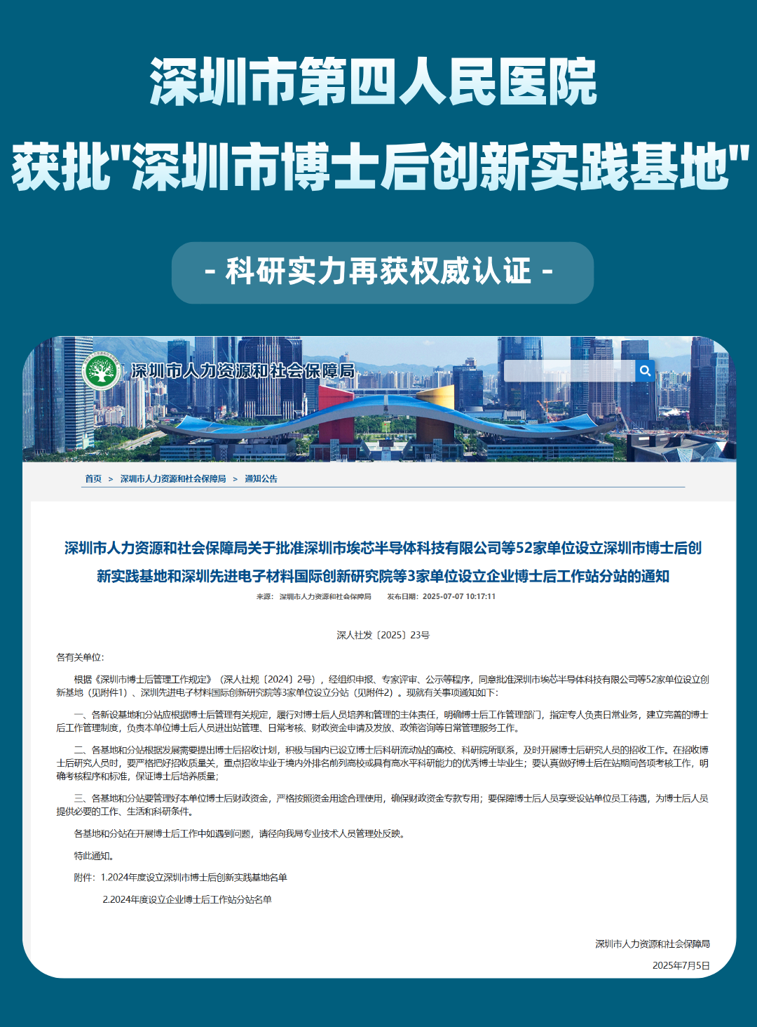 不久前,深圳市人力资源和社会保障局公布了2024年深圳市博士后创新实践基地的设立名单,其中深圳市第四人民医院荣幸入选。此次深圳市共设立了五十二所博士后创新实践基地。