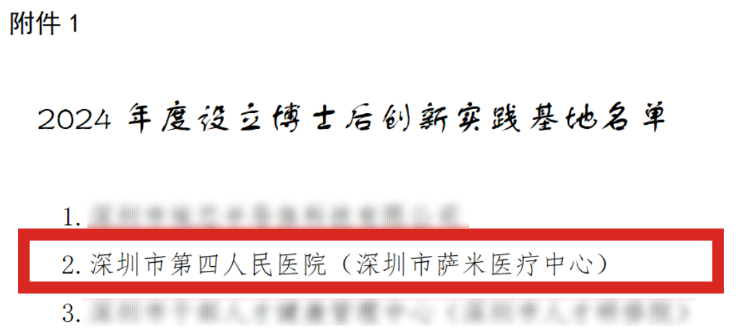 深圳市第四人民医院(深圳市萨米医疗中心)获批设立深圳市博士后创新实践基地。